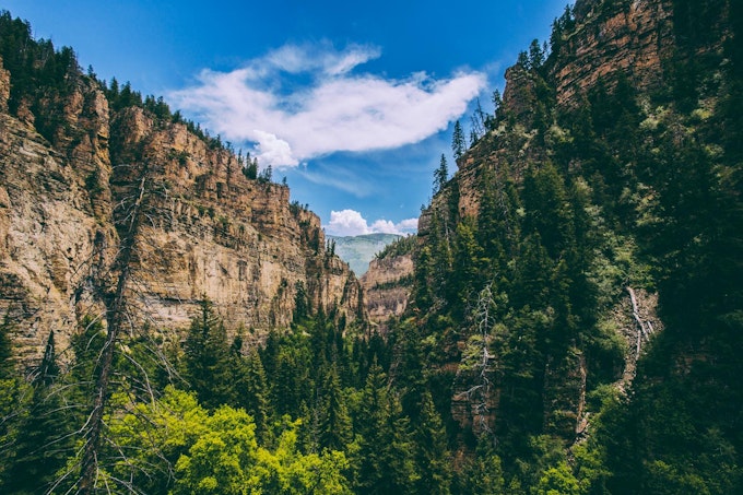 When we made it to the parking lot, the rain had dissipated, leaving a heavy humidity, that grew warmer as the sun slowly emerged from behind the haze. As we walked to the trailhead, I was overwhelmed by the splendor of the canyon. The rock towered above us, its jagged hands outstretched toward the sky. We made our way onto the trail and quickly began the steep ascent into the mountains. I immediately felt my heart begin to race, both the altitude and my excitement taking over me. We talked intermittently; short conversations abruptly, cutoff by our breathlessness, and stopped from time to time to take in the view and re-hydrate. The trail wound around the edge of the mountain, hidden within the shadows of the forests, and bathed in the sunlight as the path continued onto the edge of the exposed cliff.