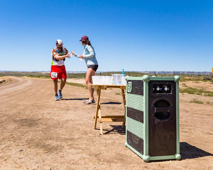 Remarkably, all that sound comes from one (swappable) lithium-ion battery that delivers 40 hrs of playback at close to full volume. I purchased a second battery and I have *never* gone without sound, even in a rainstorm on the west coast of Vancouver Island and in the scorching heat of Wyoming's Red Desert for an ultramathon (our aid station was clearly the most fun).
