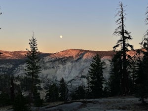 6.22 mi / 1089 ft gainThis is a moderate hike out to an overlook of Clouds Rest, Half Dome, and the east end of Yosemite Valley. There is some parking on both sides of the road about 1.5 miles west of Olmsted Point. One side is gravel with parking for ~6 vehicles and offers bear boxes for food while the other is a pa...Read more -